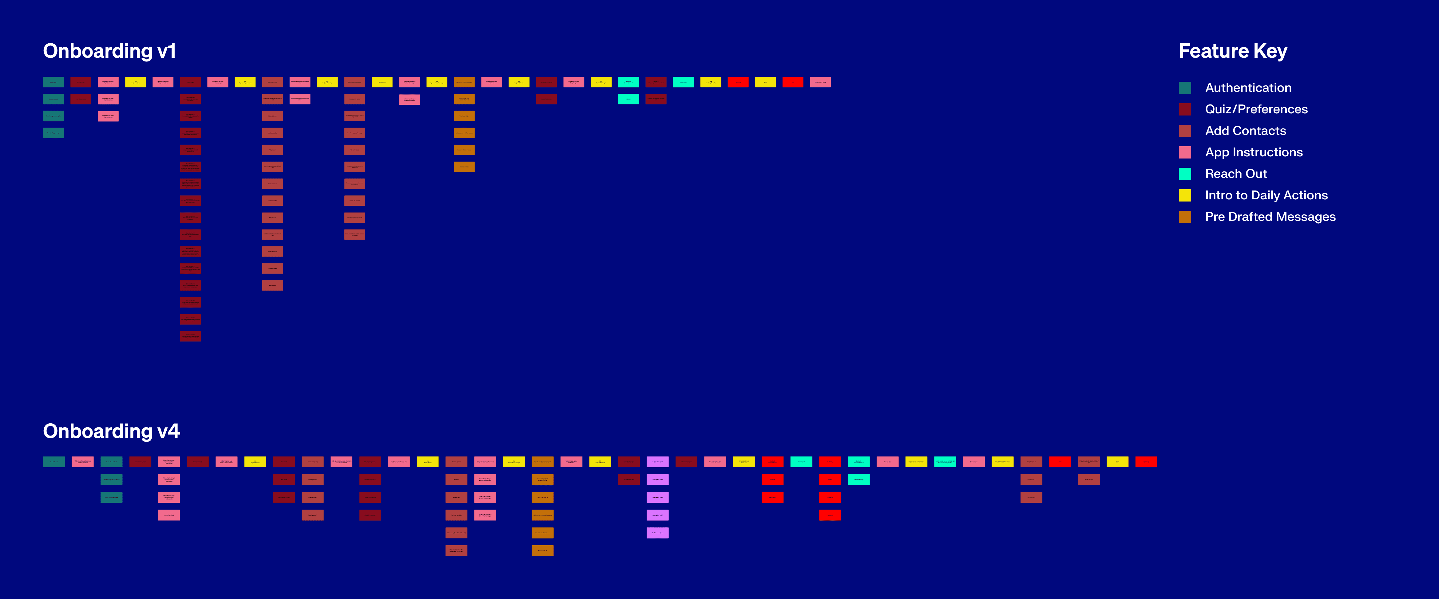 The above diagram is an example of how the human centered design process affected the onboarding narrative over 4 iterations.